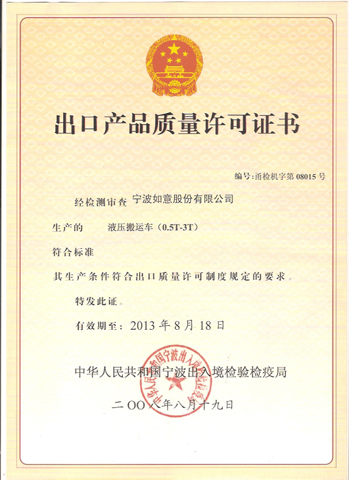 西林液壓搬運(yùn)車出口質(zhì)量許可證